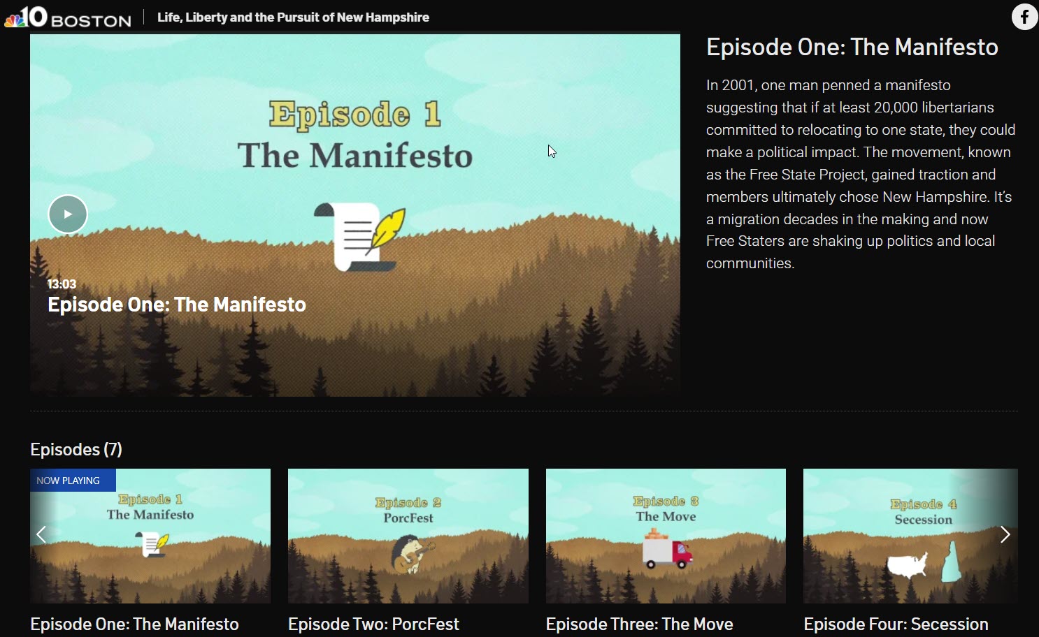 NBC 10 Boston did a (fairly) balanced documentary on the Free State Project. Besides repeatedly showing Free Staters wearing side-arms and shooting guns (which is a dog whistle for liberals trained by the media to fear any guns not wielded by the "Government"), the series actually let the members of the project explain what is going down in New Hampshire. There are seven episodes each under 15 minutes and definitely binge-watching worthy!