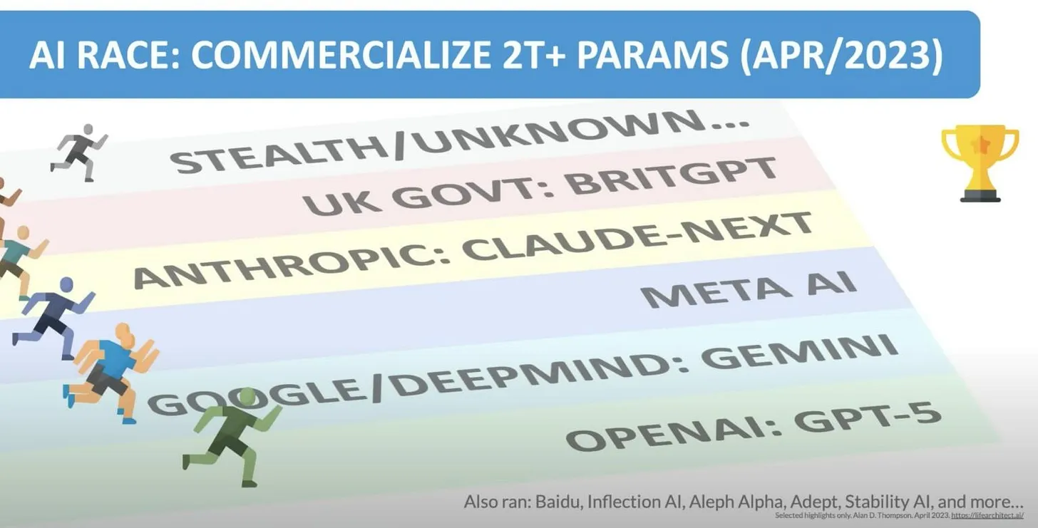 There are six major AI projects in the race beyond 2 trillion parameter models. There is OpenAI, Anthropic, Google/Deepmind, Meta, a UK government project and a stealth project.