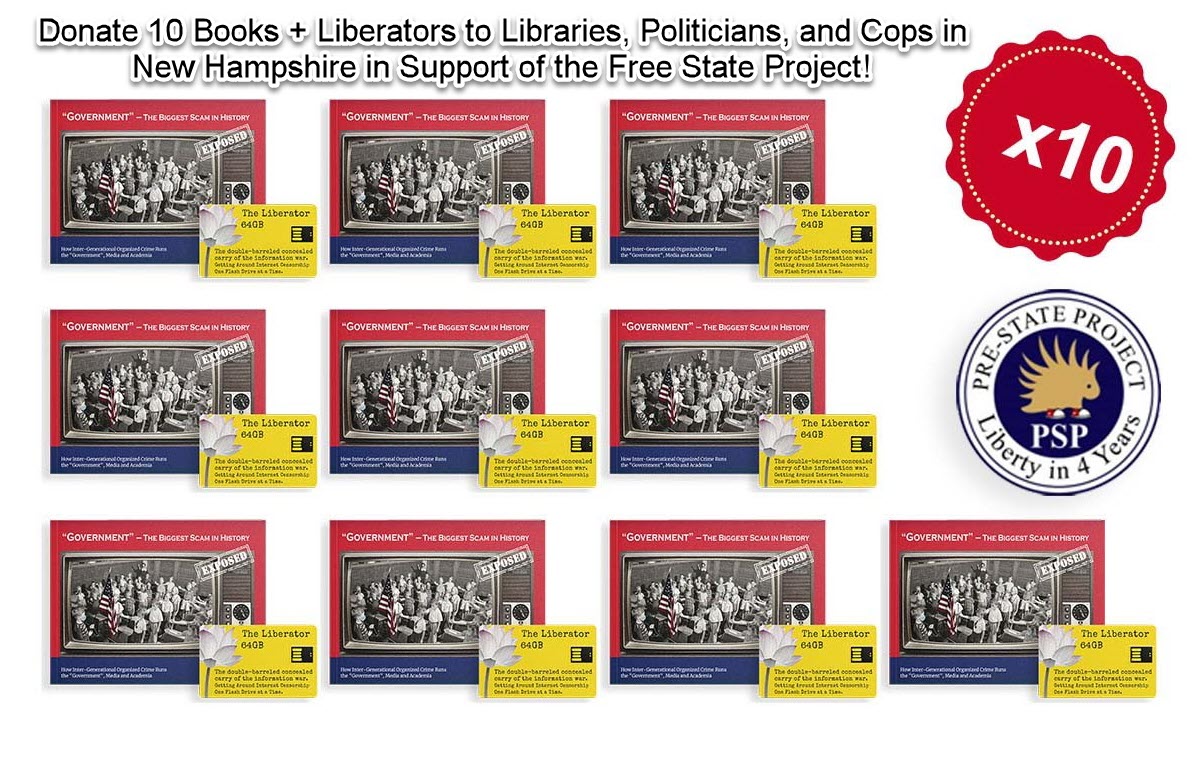 Click HERE to donate 10 copies of "Government" & 10 Liberators to NH Libraries, politicians and/or cops! Postage for each copy is included and you can either provide a list of who they get sent to OR we will send them to those folks where we think we can have the biggest impact.
