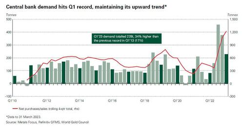 It may not be the off the charts gold buying observed in the second half of 2022, but central bank Central bank gold buying made a blistering start to 2023 when according to the latest report from the World Gold Council, demand for the hard currency by the world's money-printing authorities reached 228 tonnes in Q1, a 176% increase compared to the 82.7 tonnes one year ago. While lower than the figures seen in the previous two quarters this was nonetheless the strongest first quarter on record. According to the WGC, "this is all the more impressive considering it follows the record-breaking pace of demand last year."