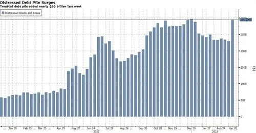 The cascade of defaulted regional US banks is blowing out the circulating inventory of distressed debt which expanded by about $65.9 billion last week as US insolvency courts saw six new, large bankruptcy filings, according to data compiled by Bloomberg.