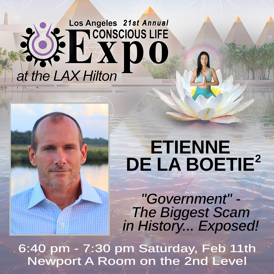 Etienne de la Boetie2, author of "Government" - The Biggest Scam in History... Exposed! will be speaking on Saturday, Feb 11th at 6:40-7:30 PM in the Newport A Room on the 2nd Floor.