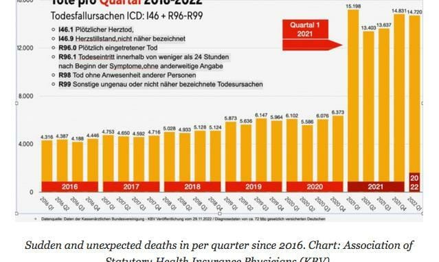 Germany: The Association of Statutory Health Insurance Physicians (KBV) released data obtained from 72 million insured people. The data shows that the death rate more than doubled since COVID vaccines were introduced at the end of 2020, jumping from about 6000 per quarter to 14,000 currently.