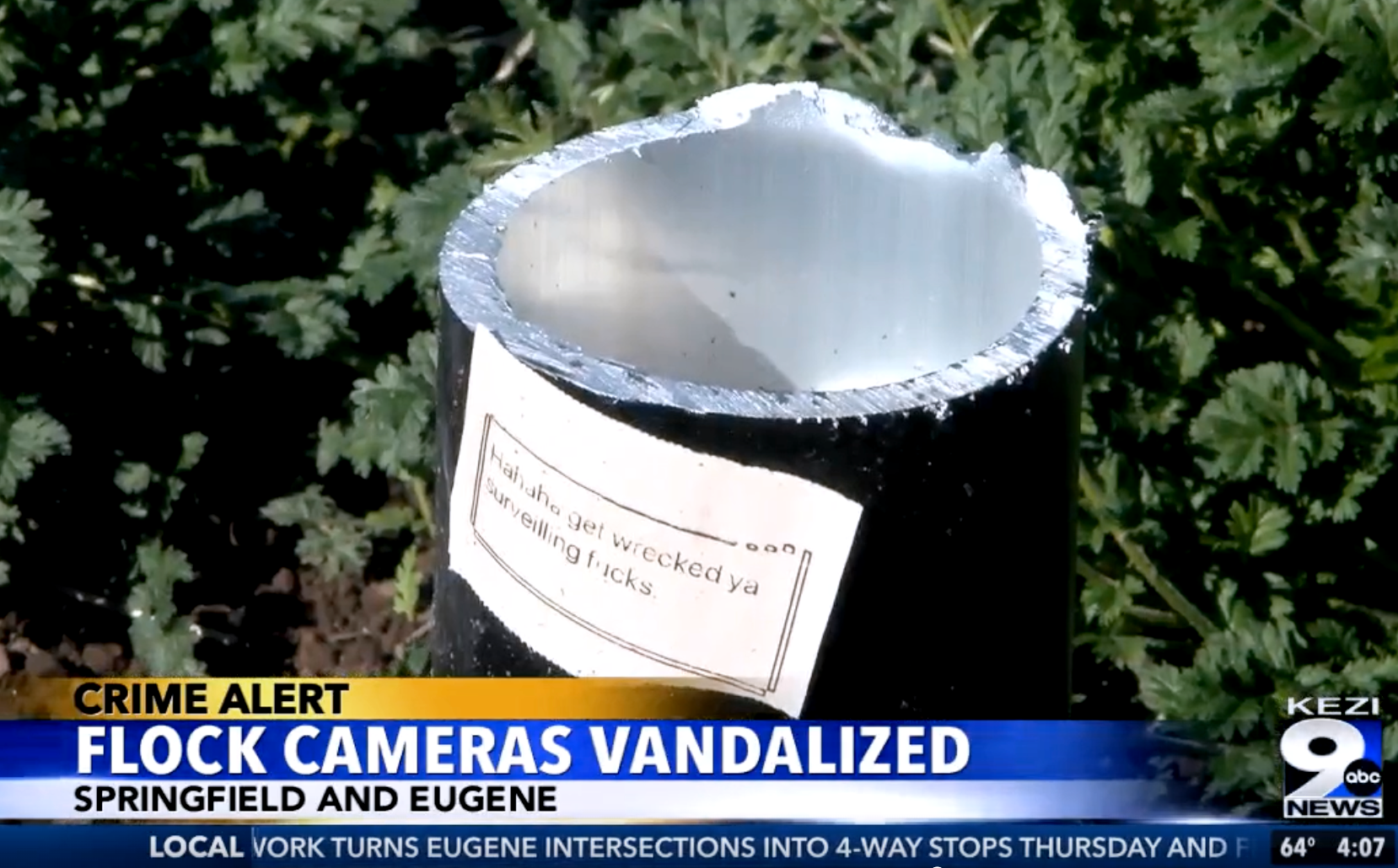 A note reading “Hahaha get wrecked ya surveilling fucks” was attached to one of the destroyed poles, and somewhat incredibly, broadcast on the local news.