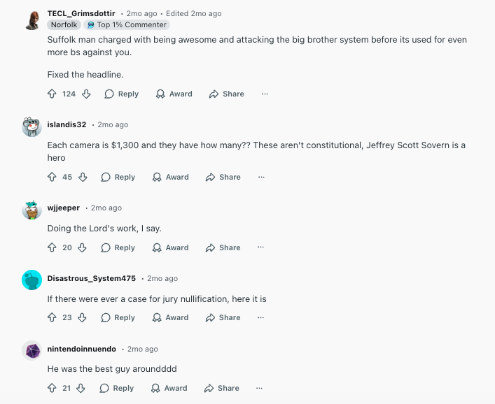 In his GoFundMe, Sovern also mentioned the support for him he’d seen on forums online, so I went over to Reddit to get a sense for how his actions were being received online. Here was the page that shared news of his arrest for destroying the Flock cameras: