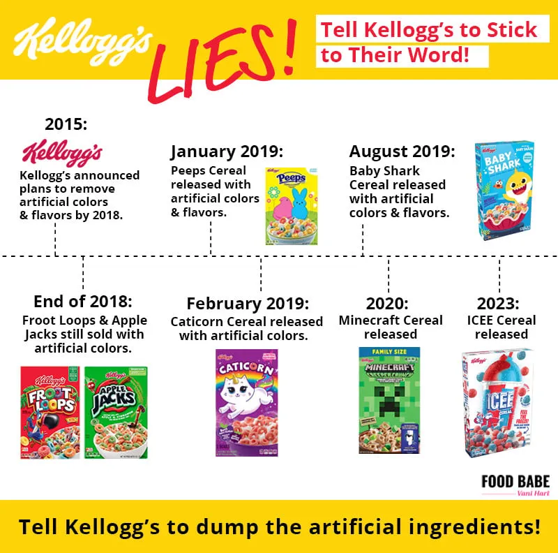 Even worse, Kellogg’s continues launching NEW cereals for children filled with artificial ingredients, such as Minecraft Frosted Flakes and Disney's Little Mermaid Cereal.