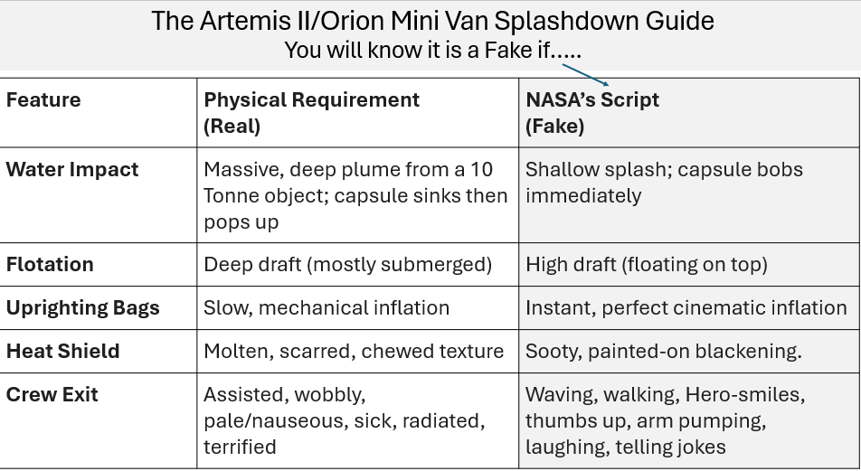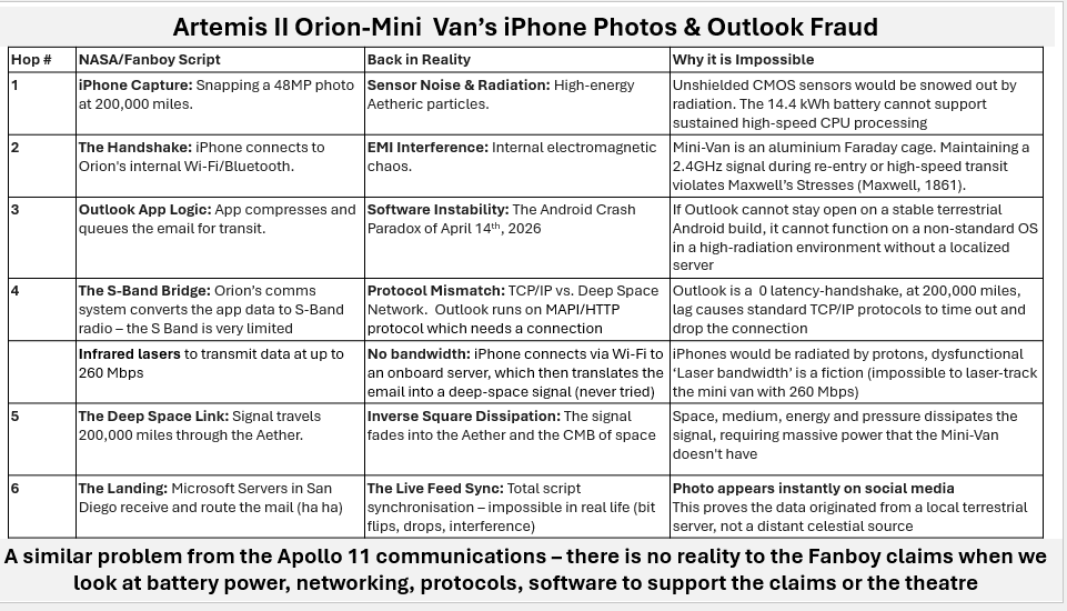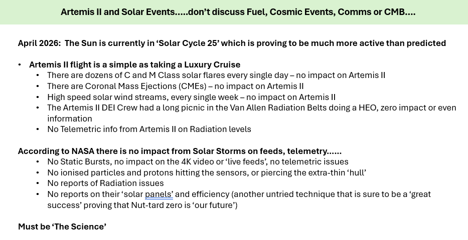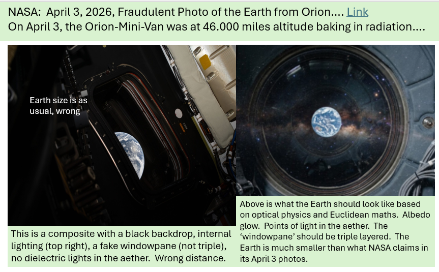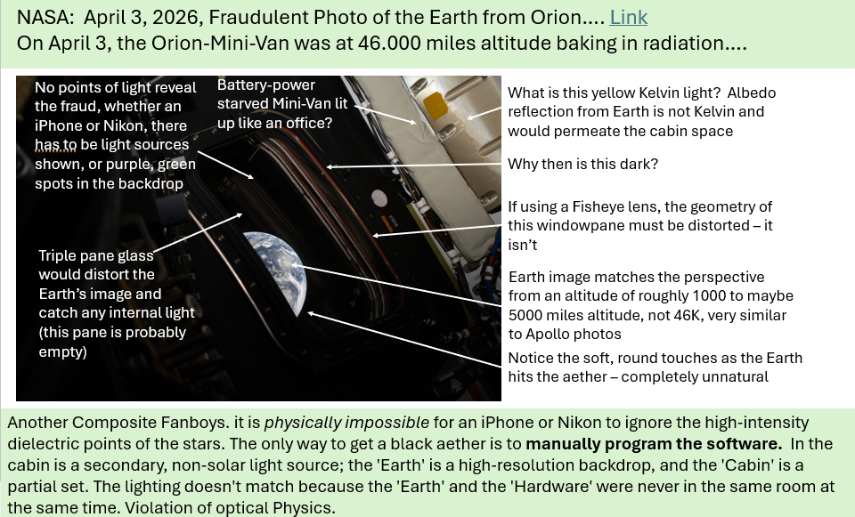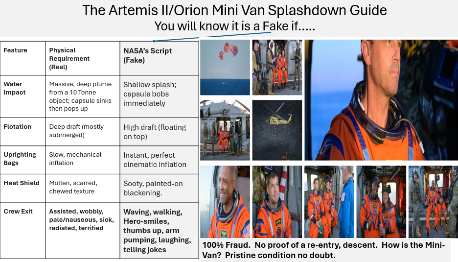 With Artemis II, as with the fraud of Apollo 11, we should expect that popular emotions and religious belief will triumph critical thinking skills, analysis and critiques. The Fanboys and Sheeple, attending their weekly masses in the Church of Science, will say prayers of thanks and gratitude. They will give homage to NASA, their god of ‘the space science’ and declare ‘We did it’, whoever ‘We’ is.