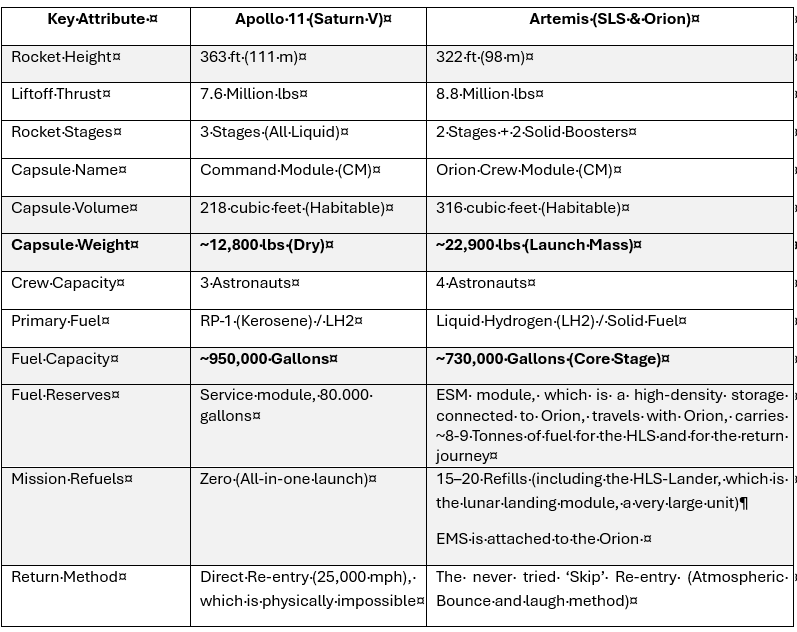 1. Artemis II has less fuel capacity than Apollo 11-Saturn V (-20%) and is almost double the weight. I am not sure this is ‘progress’.