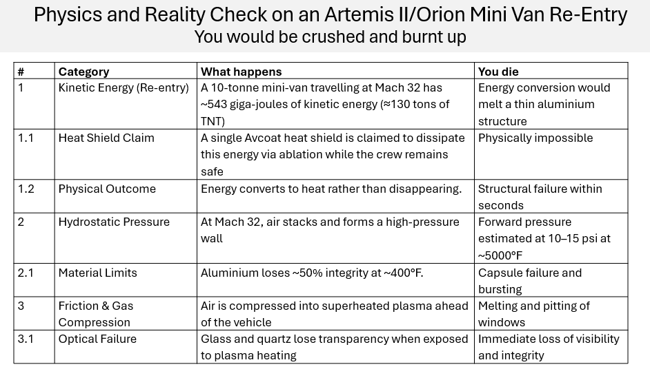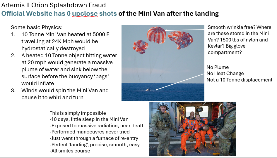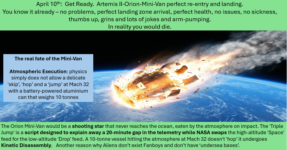 The author penned this in January 2026 after being on a few podcasts on this subject. The original said there was a 3 % chance of success of a Moon fly by - not a landing - by the Orion Mini-Van. This prediction has been vindicated. The Artemis II-Orion Mini Van spectacle has been such an obvious deceit and mendacity that NASA should be shut down.