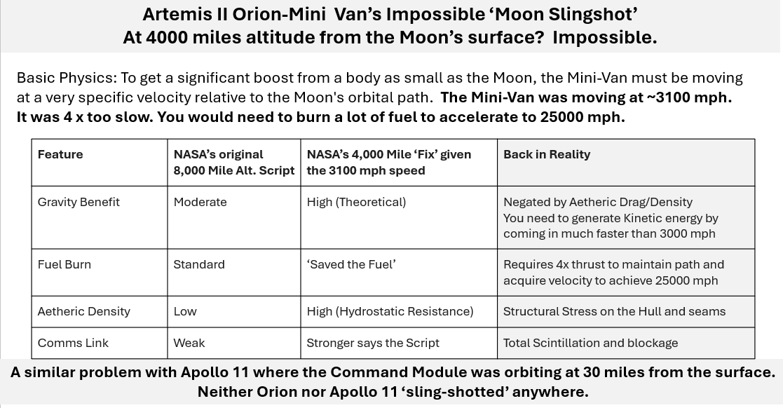 5. For a return journey, Artemis-Orion must use the ESM and avoid the ‘gravity’ of the supposedly ‘atmosphereless’ Moon (gravity only operates in a medium or aether, it is a weak force). There is no evidence of either with Apollo 11.