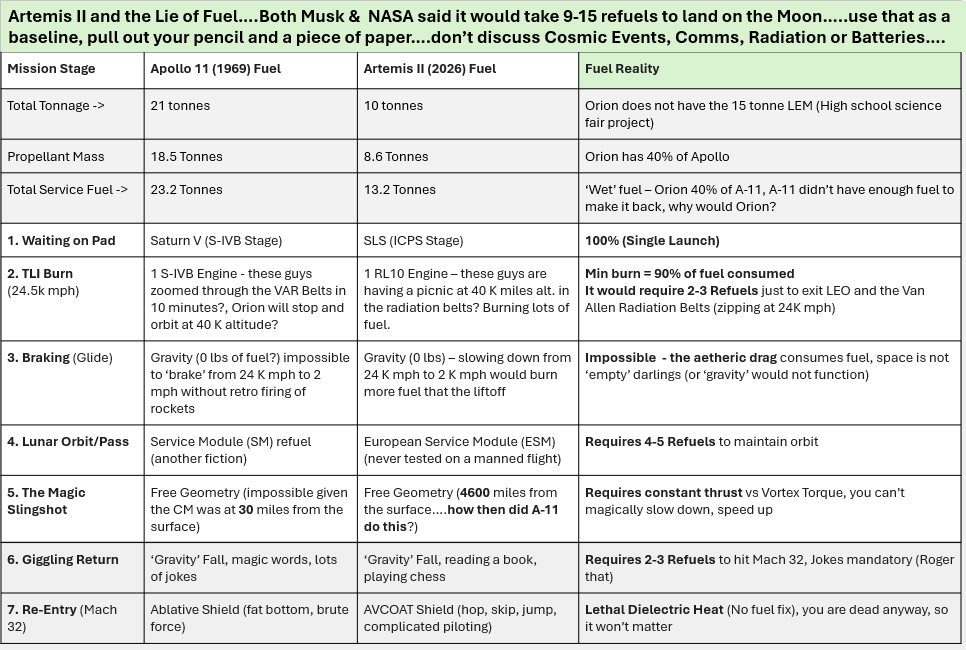 2. Even without a lander, Artemis needs refueling for a return flight. The HLS (lunar module) is not a part of Artemis II (Artemis III + HLS in 2027 promise a Moon landing. Golf clubs being cleaned as we type). This again disproves Apollo 11.