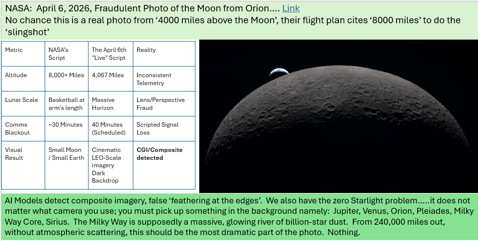 This post is for any who are interested in the claims by NASA that Artemis II, which will be launched on February 6 2026, during Easter-tide April 2026 will do a ‘fly by’ of the Moon. This has been promised every year for a decade. The date is not a coincidence. The Church of NASA playing God and Science promoted as salvation. You might remember Trans-sexual ‘Day’ being promoted at Easter a few years ago under the half wit actor playing Biden. Nothing is done by chance.