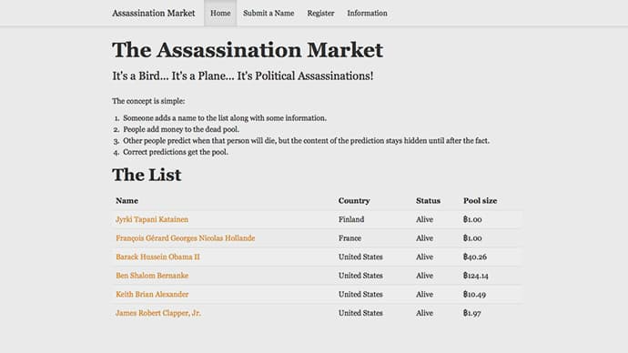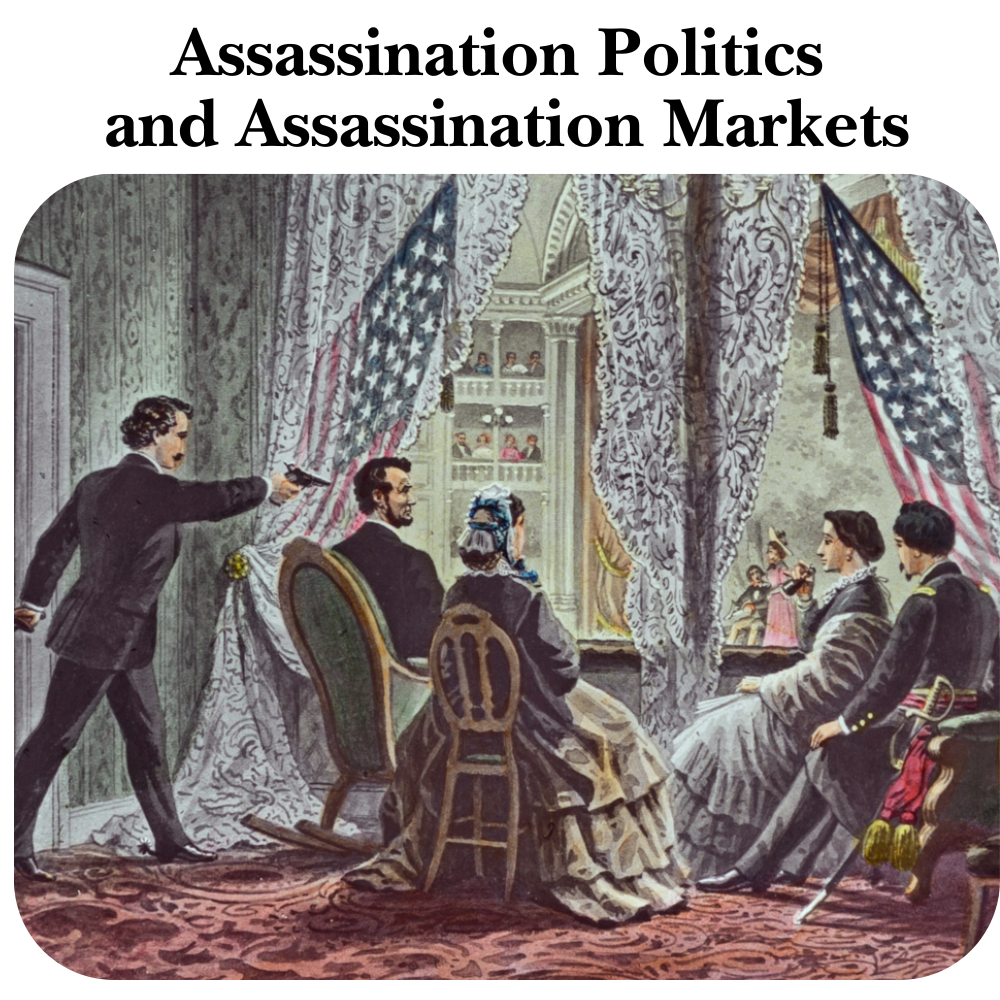 Assassination Markets—While Nick Roberts came up with the original idea and sound moral and economic arguments in favor of assassination politics, Jim Bell built on the idea, providing a framework for a decentralized, anonymous way of targeting enemies of peace, foreign and domestic. In Bell's thought experiment, a website could be constructed where political or economic criminals could be nominated for assassination.