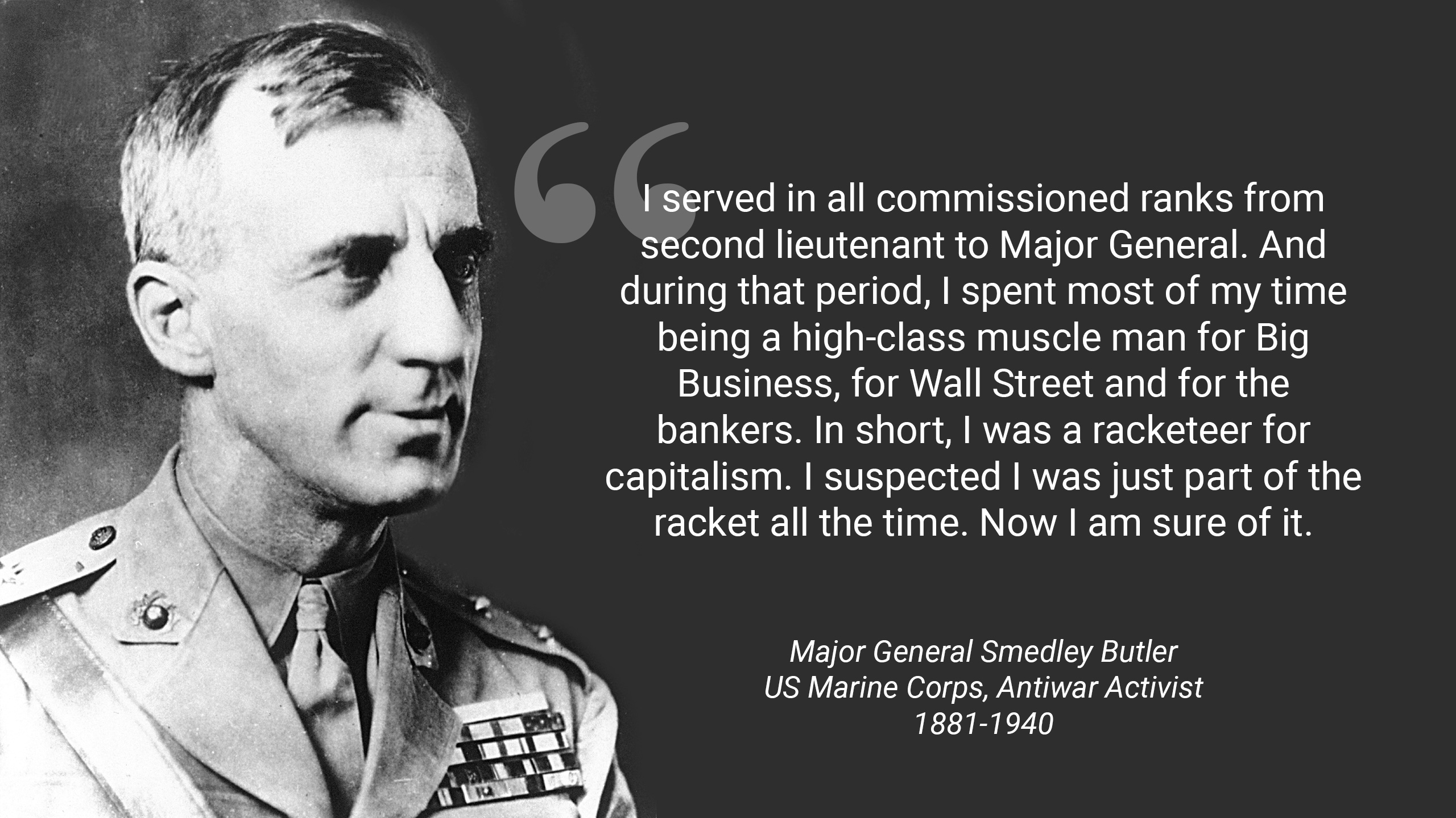 "War is just a racket. A racket is best described, I believe, as something that is not what it seems to the majority of the people. Only a small inside group knows what it is all about. It is conducted for the benefit of the very few at the expense of the masses." "I spent thirty-three years and four months in active military service as a member of this country's most agile military force, the Marine Corps. I served in all commissioned ranks from Second Lieutenant to Major-General. And during that period, I spent most of my time being a high class muscle-man for Big Business, for Wall Street and for the Bankers. In short, I was a racketeer, a gangster for [crony] capitalism.
