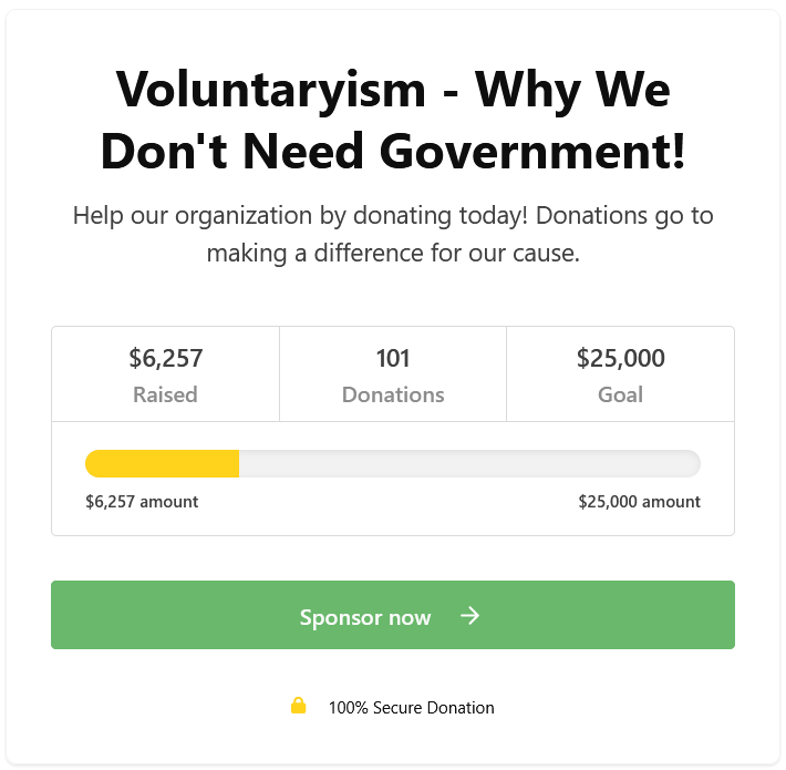 Our goal is to raise $25,000 to finish up and launch our upcoming book: Voluntaryism - How the Only “ISM” Fair for Everyone Leads to Harmony, Prosperity and Good Karma for All! We have currently raised $6257 from 101 donors (including pre-sales) and have $18,743 left to go! We have some great perks to say THANK YOU! ↩