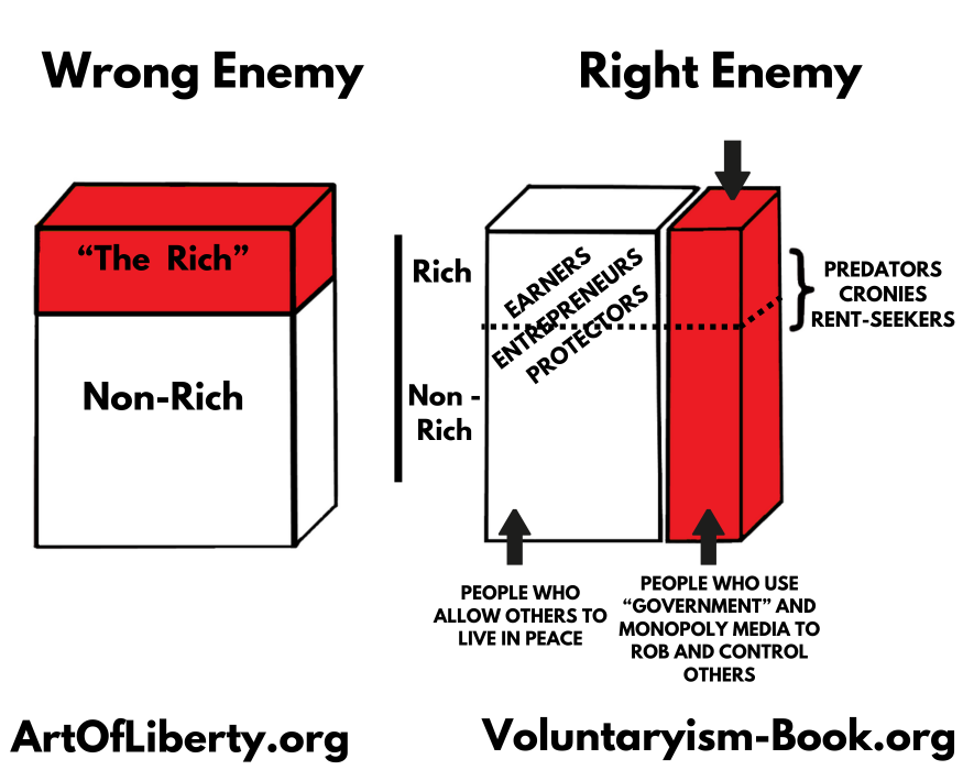 In Samuel Konkin's Agorist Class Theory, he presents a counter idea to that raised by Karl Marx and Friedrich Engels, the authors of The Communist Manifesto. According to Konkin, rather than the proletariat (the workers) being pitted against the bourgeoisie (the capitalists), a more accurate description would be the parasites (those involved in and living off money stolen from others at the point of a gun using "government") versus the producers (voluntary market participants).