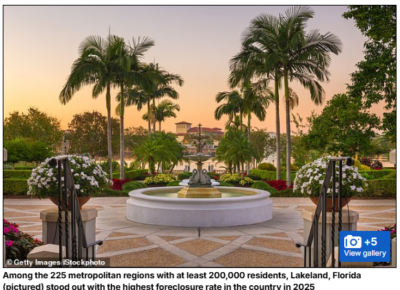 A closer look at metro areas paints an even starker picture. Among the 225 metropolitan regions with at least 200,000 residents, Lakeland, Florida, stood out with the highest foreclosure rate in the country in 2025, with one in every 145 homes entering the foreclosure process.