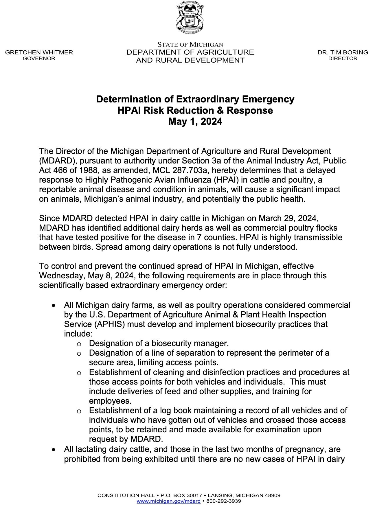 All Michigan commercial dairy farms and poultry operations now ordered to follow military-style BIOSECURITY procedures starting May 8
