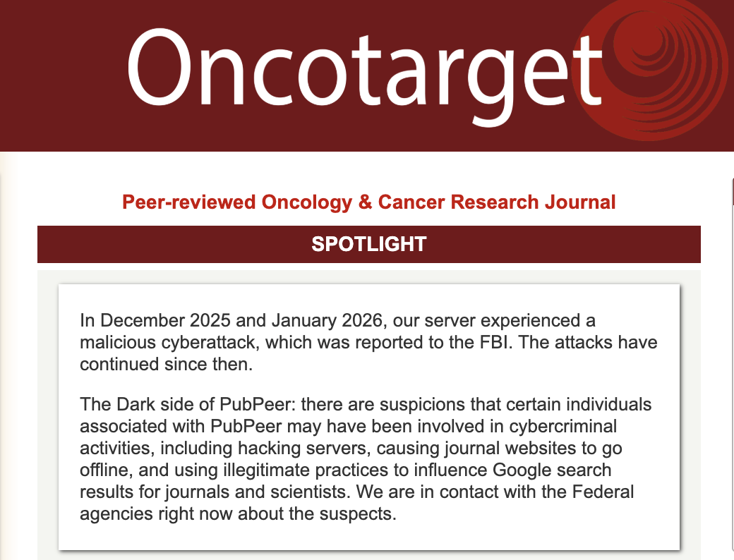 The journal further states that it is investigating whether individuals associated with PubPeer (PubSmear Mob) may have engaged in or facilitated cybercriminal activity, including server hacking, taking journal websites offline, and manipulating Google search results to suppress journals and scientists. Oncotarget reports that it is currently in contact with federal law-enforcement agencies regarding identified suspects.