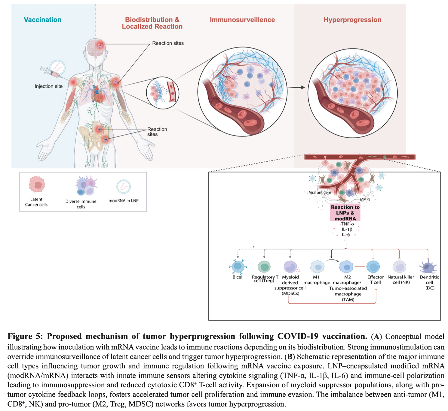 Figure 5 illustrates how lipid nanoparticle–encapsulated mRNA can trigger strong localized and systemic immune activation, including cytokine release (TNF-α, IL-1β, IL-6). This immune shift reduces cytotoxic CD8⁺ T-cell and NK-cell activity while expanding immunosuppressive populations (Tregs, MDSCs, M2 macrophages), creating conditions that allow latent or controlled tumors to escape immune surveillance and rapidly progress.
