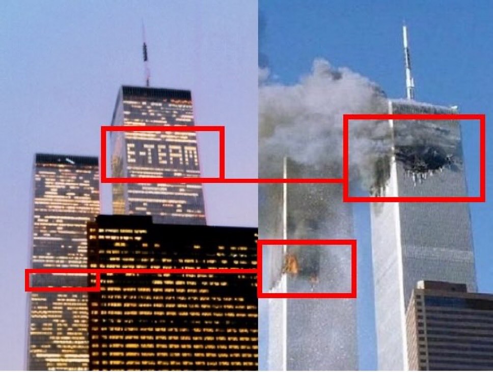 The 2nd “Artist Collective,” The E-TEAM (Franziska Lamprecht, Hajoe Moderegger, and Daniel Seiple), coordinated with tenants in the WTC complex to spell out the word "E-TEAM" (Explosive Team?) by using the windows between the 89th and 95th floors of WTC1 on March 29th 2001. Those floors would be, essentially, the exact same floors of the impact zone on the exact same side of the exact same building on 9-11.