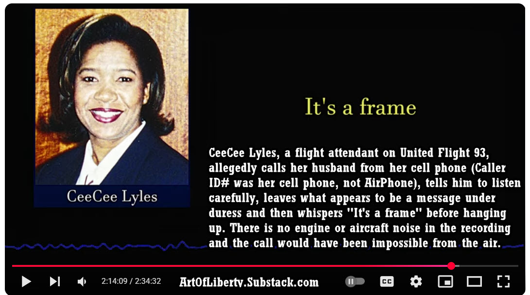 In one of the most potent pieces of evidence that I had never heard before, Director Zerbo breaks down the complete impossibility of the numerous cell phone calls from the passengers to their loved ones. In the case of stewardess CeeCee Lyles, whose phone call to her husband was recorded by their answering machine, there is no engine or background noise to indicate that she is on an airborne aircraft.