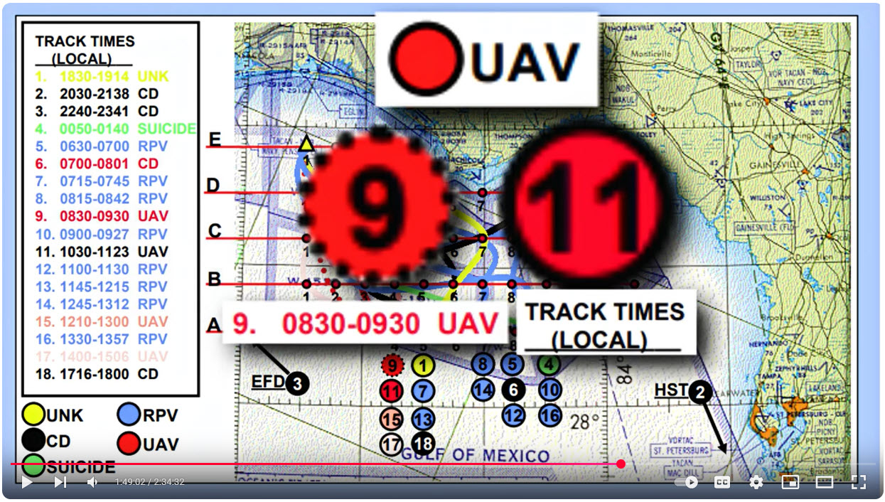 In what appears to be a “Funny Ha Ha,” by the perpetrators, the two UAVs in the exercise were numbered “9” and “11.” The “9” UAV was scheduled to be airborne at the exact same time (08:30-09:30am) as the 9-11 planes were allegedly hijacked and crashed into the WTC complex.