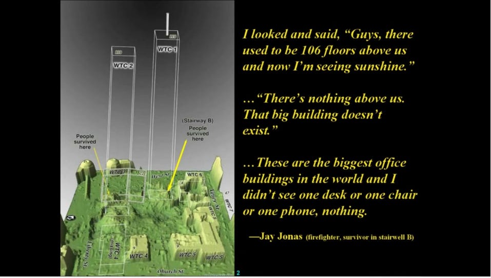 Etienne Note: WTC 7 appears to have been conventional explosives. In contrast, WTC 1&2 appear to have been thermite/thermate used in the buildings where certain floors were “re-fireproofed” with spray on thermite/thermate to initiate the collapse without visible squibs; conventional explosives were used to begin/accelerate the collapse, and a Directed Energy Weapon (DEW) used to pulverize the remainder of the buildings once they achieved the effect of making it look like a gravity collapse.