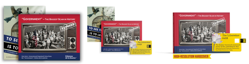 1.“Government”– Companion media to “Government” – The Biggest Scam in History… Exposed! and To See the Cage is to Leave It , 2. False Flag Terrorism for Police State and Hoax Shootings for Gun Control, 3. “The Covid” - Plandemic & Economic Warfare, 4. Voluntaryism - The Only Political “ISM” Fair For All, 5. Prepping and Survivalism. Preview the entire contents at Government-Scam.com/Liberator