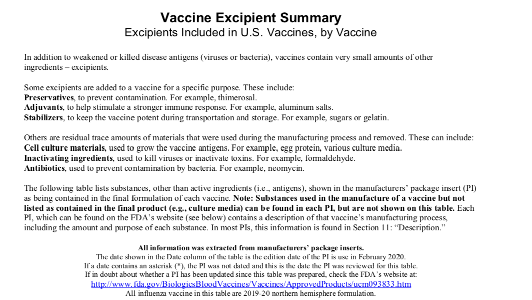 Today, I’d like to share a document I reviewed back in 2020. It is a summary of the excipients included in vaccines given to infants-adults in the U.S. Full PDF is below.
