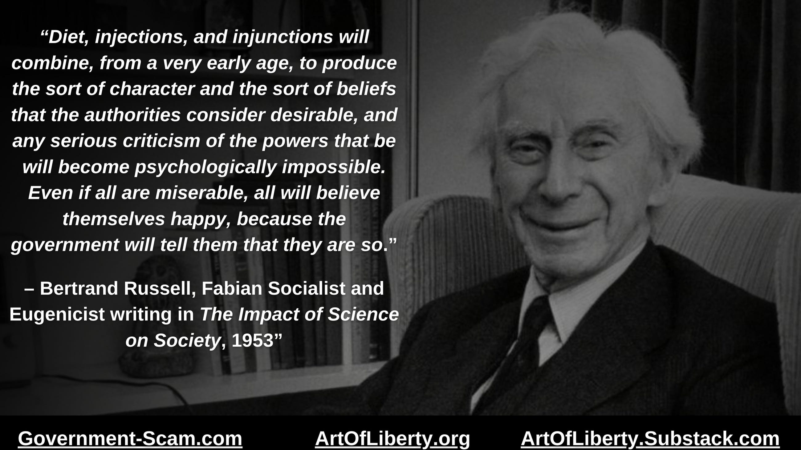 “Diet, injections, and injunctions will combine, from a very early age, to produce the sort of character and the sort of beliefs that the authorities considerdesirable, and any serious criticism of the powers that be will become psychologically impossible. Even if all are miserable, all will believe themselves happy, because the government will tell them that they are so.” – Bertrand Russell, Fabian Socialist and Eugenicist writing in The Impact of Science on Society, 1953.