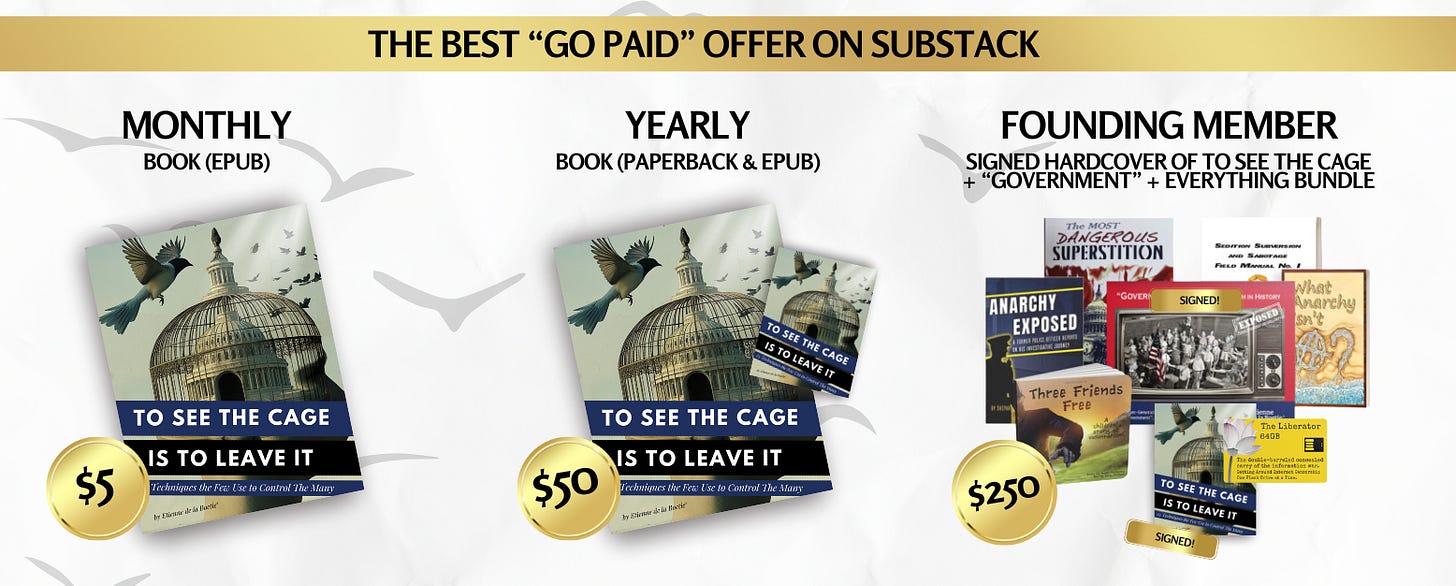 Go paid at the $5 a month level, and we will send you both the PDF and e-Pub versions of Etienne’s new book: To See the Cage Is to Leave It - 25 Techniques the Few Use to Control the Many and a coupon code for 10% off anything in the https://artofliberty.org/store/.