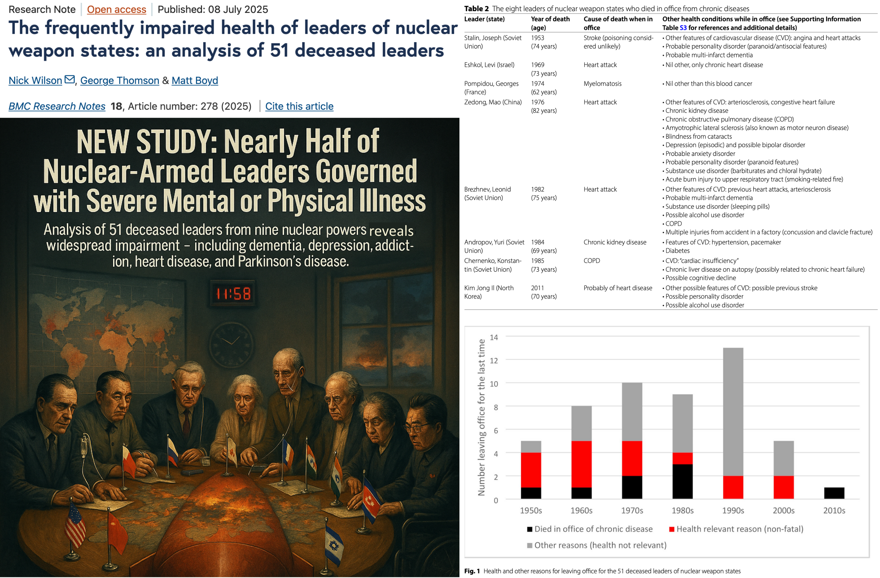 A new peer‑reviewed study titled, The frequently impaired health of leaders of nuclear weapon states: an analysis of 51 deceased leaders, has revealed a chilling truth: 45% of past leaders of nuclear‑armed nations since the dawn of the atomic age had health conditions that could impair judgment — some while holding sole authority to launch nuclear weapons…