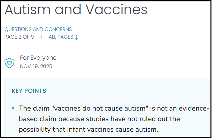 “Scientific studies have not ruled out the possibility that infant vaccines contribute to the development of autism. However, this statement has historically been disseminated by the CDC and other federal health agencies within HHS to prevent vaccine hesitancy.”…