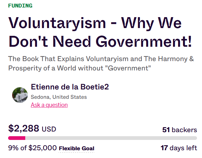 Our IndieGoGo for my new book: Voluntaryism - How the Only “ISM” Fair for Everyone Leads to Harmony, Prosperity and Good Karma for All! has raised $2288 from 51 backers or 9% of our $25,000 goal in less than a week with 17 days left! You can get some great perks for pre-ordering at https://www.indiegogo.com/projects/voluntaryism-why-we-don-t-need-government