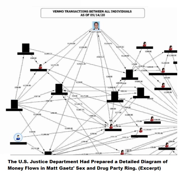 Today’s New York Times carries a diagram prepared by the U.S. Department of Justice during its multi-year investigation into then Congressman Matt Gaetz. (We have printed the left-hand section of the diagram above.) The diagram illustrates the following about the DOJ’s investigation into the man that President-elect Donald Trump wants to install as the U.S. Attorney General – the top law enforcement officer at the U.S. Department of Justice…
