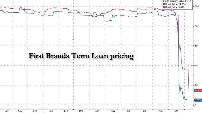 Hot on the heels of the spectacular implosion of subprime auto lender Tricolor (whose name is a not too subtle reference to the Mexican flag, and appropriately so as the company was almost exclusively targeting illegal aliens as its customers, so probably not a shock that it had a very unhappy ending), last month’s mega bankruptcy was that of First Brands, an auto parts supplier with $5.8 billion in outstanding leveraged loan debt, yet it increasingly appears the company had far more liabilities than previously known as a result of what now learn learn.