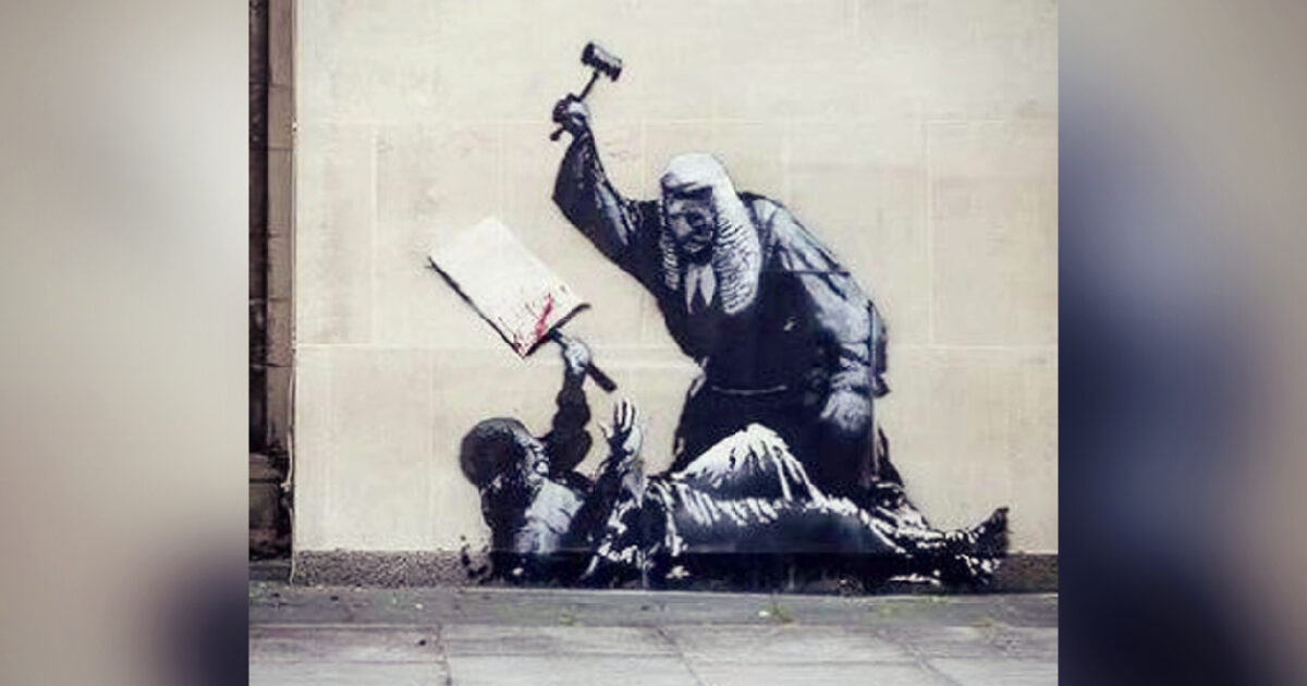 The new Banksy shows a judge hitting a fallen protester with his gavel, and was painted on the front wall of the Royal Courts of Justice in London…