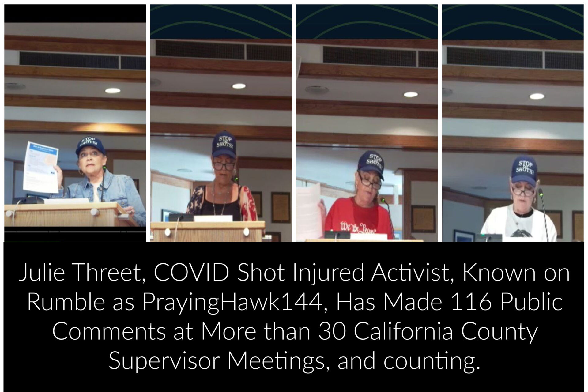For more than four years, Julie Threet has stood at podiums across California, delivering over 116 verbal public comments in county chambers, city council meetings, and state regulatory hearings — warning officials about the dangers of the Covid-19 vaccine.