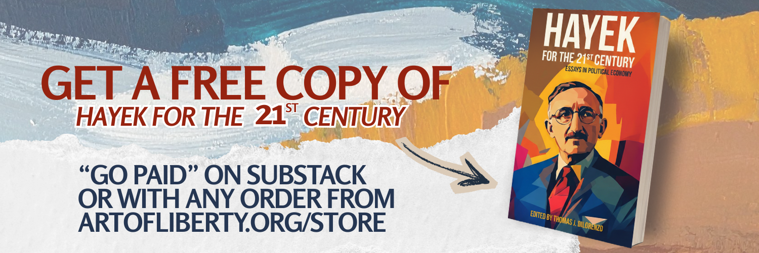 As part of the Art of Liberty Foundation’s Tribute to Nobel Laureate F.A. Hayek, in cooperation with the Mises Institute and the US Justice Charitable Foundation who provided free copies, the Art of Liberty Foundation is helping promote and distribute the book to anyone who “Goes Paid” as an annual member on Substack OR makes a purchase at ArtOfLiberty.org/Store.