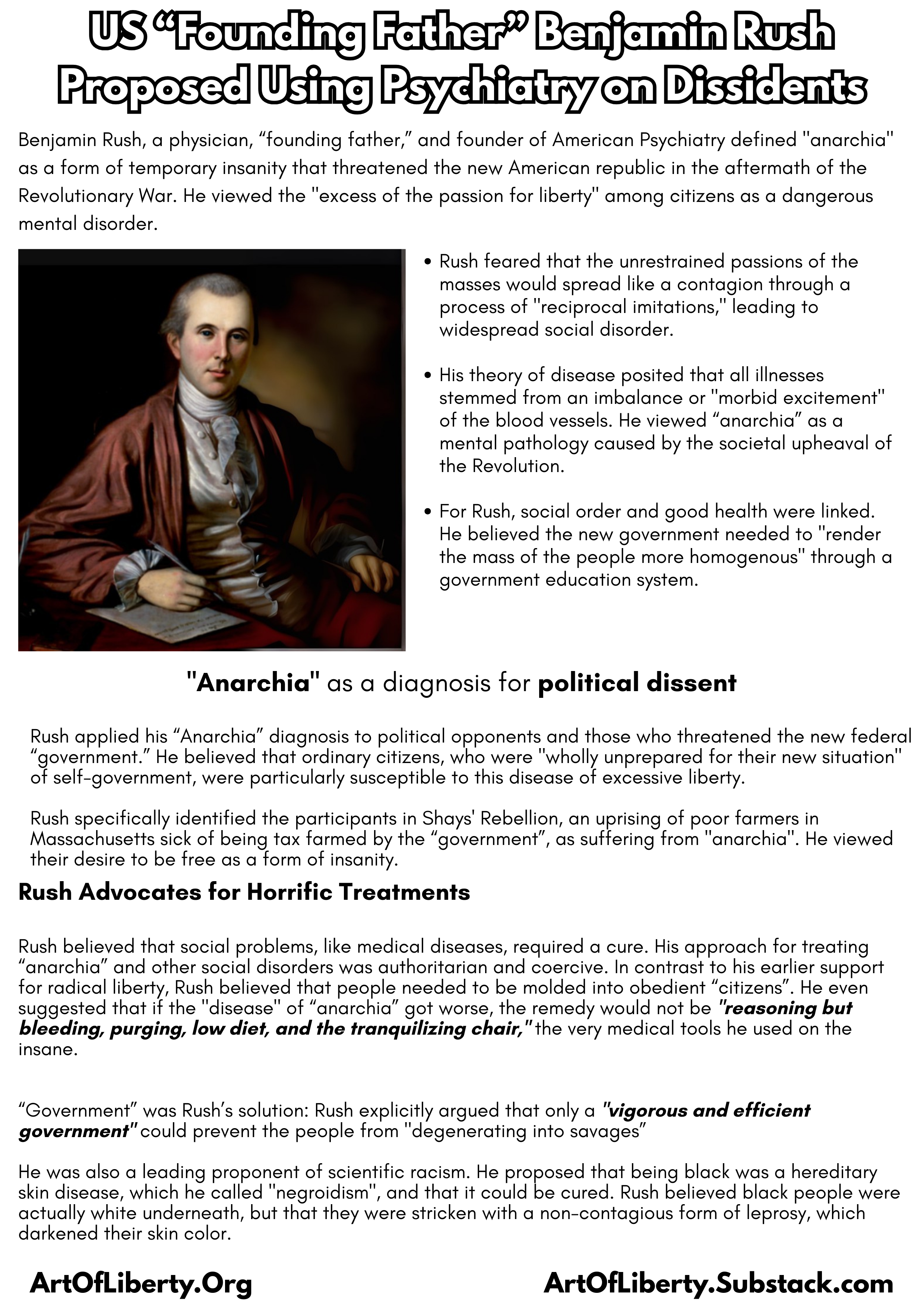 Still further back in history, Benjamin Rush—one of the founding fathers of the United States and the man officially recognized by the American Psychiatric Association as the “father of American psychiatry”—made early contributions to the weaponization of psychiatry by inventing a number of mental disorders to pathologize dissent. The most notable of these made-up disorders was “anarchia,” a type of madness Rush defined as “an excess of the passion for liberty,” which “could not be removed by reason, nor restrained by government” and “threatened to render abortive the goodness of heaven to the United States.”