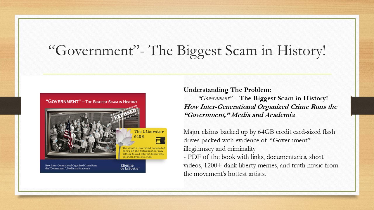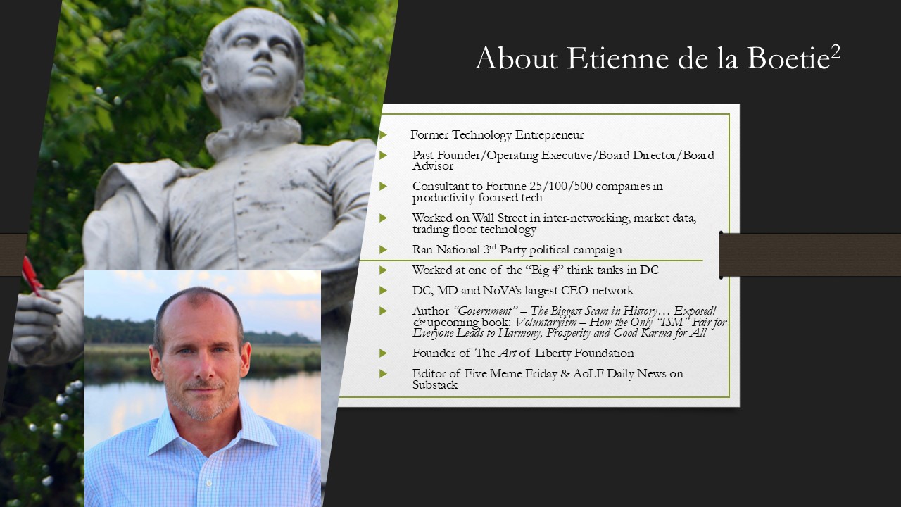 My name is Etienne de la Boetie2, I am the founder of the Art of Liberty Foundation. I'm best known for the book “Government” - The Biggest Scam in History… Exposed!, where I make the case that government is best thought of as a technique for robbing and controlling populations.