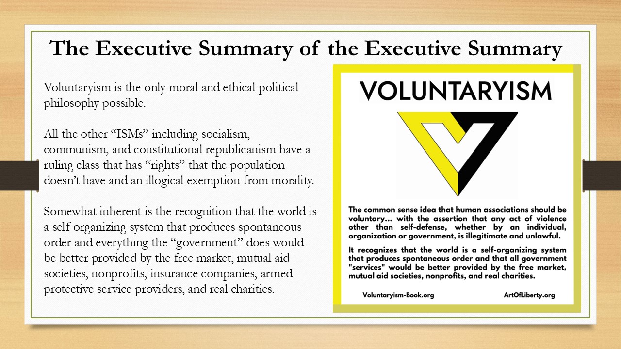 If you liked this presentation from the 2024 Liberty on the Rocks conference in Sedona, then you will love the Art of Liberty Foundation's upcoming book, Voluntaryism - How the Only “ISM” Fair for Everyone leads to Harmony, Prosperity, and Good Karma for All. The book is in the same image and meme-rich format as “Government” - The Biggest Scam in History… Exposed!, featuring “the executive summary of the executive summary” to rapidly understand the important issues. If you or anyone you know has any doubt that the free market could provide all the legitimate, non-redistributive services provided by government, better, faster, and cheaper, without the waste, fraud, abuse, and extortion, then this is the book for you. You can pre-order a copy of the book through our $25,000 Indiegogo campaign to launch it and get it into wide distribution at voluntaryism-book.org.