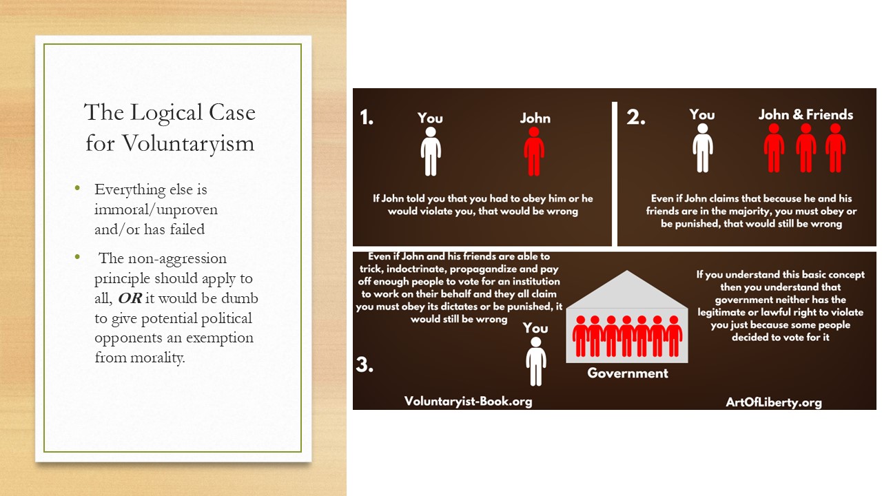 The other side of this equation is if you advocate for government, whether you're advocating for “blue government” or “red government:” You advocate for violence to be used on your friends, your neighbors, and your colleagues to impose your desired ruler over them and “voting for violence” has, as I mentioned, a karmic debt. So, there's a moral case for voluntaryism.