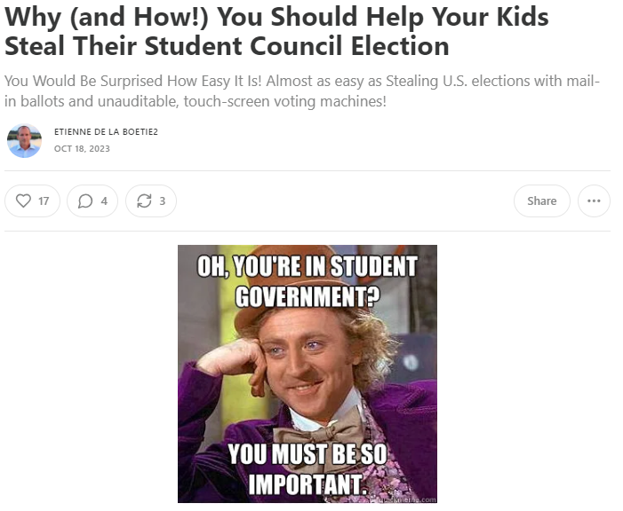 On our Substack at ArtOfLiberty.Substack.com, I have an article titled: Why (and How!) You Should Help Your Kids Steal Their Student Council Election.