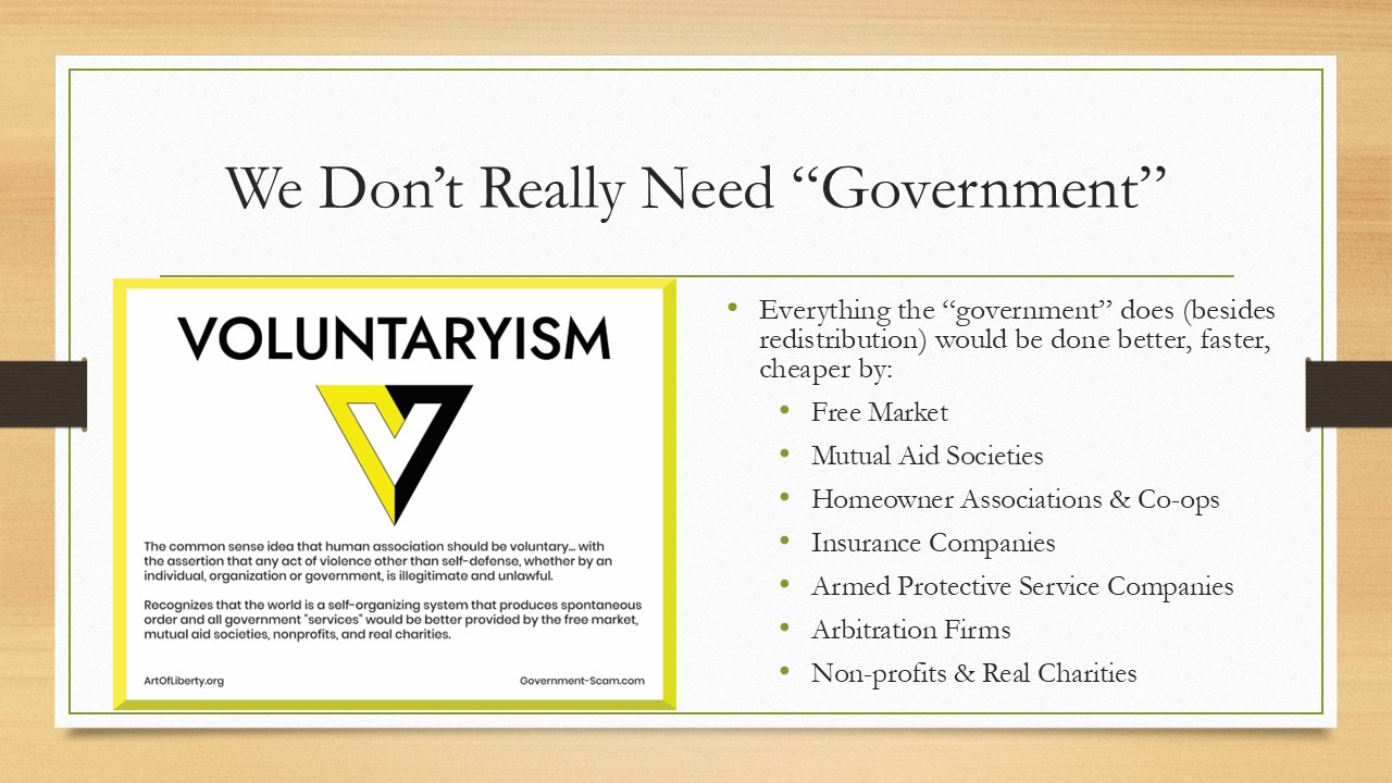 You know, we don't need government. And so, I mentioned that it's a provider of services and whether whatever that services, whether it's armed protective services that they call the police, or dispute resolution that they call the courts, all of these things could be and would be provided. And we will demonstrate to you today throughout the conference that it can be provided by the free market, mutual aid societies, homeowners’ associations and co-ops, insurance companies, nonprofits, and genuine charities.