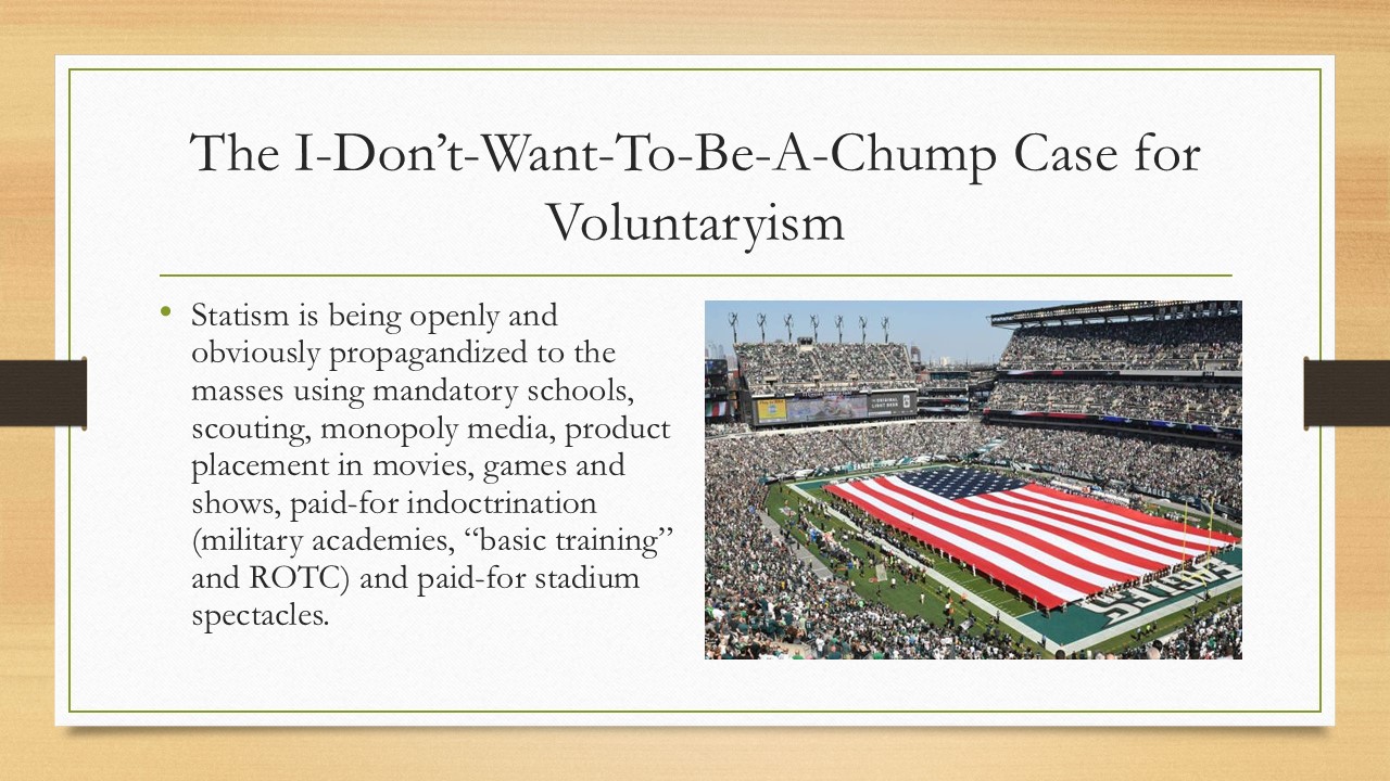 There's also the “I-Don't-Want-to-be-a-Chump” case for voluntaryism because Statism is being openly and obviously propagandized to the population using various unethically manipulative techniques that I break down in my book.