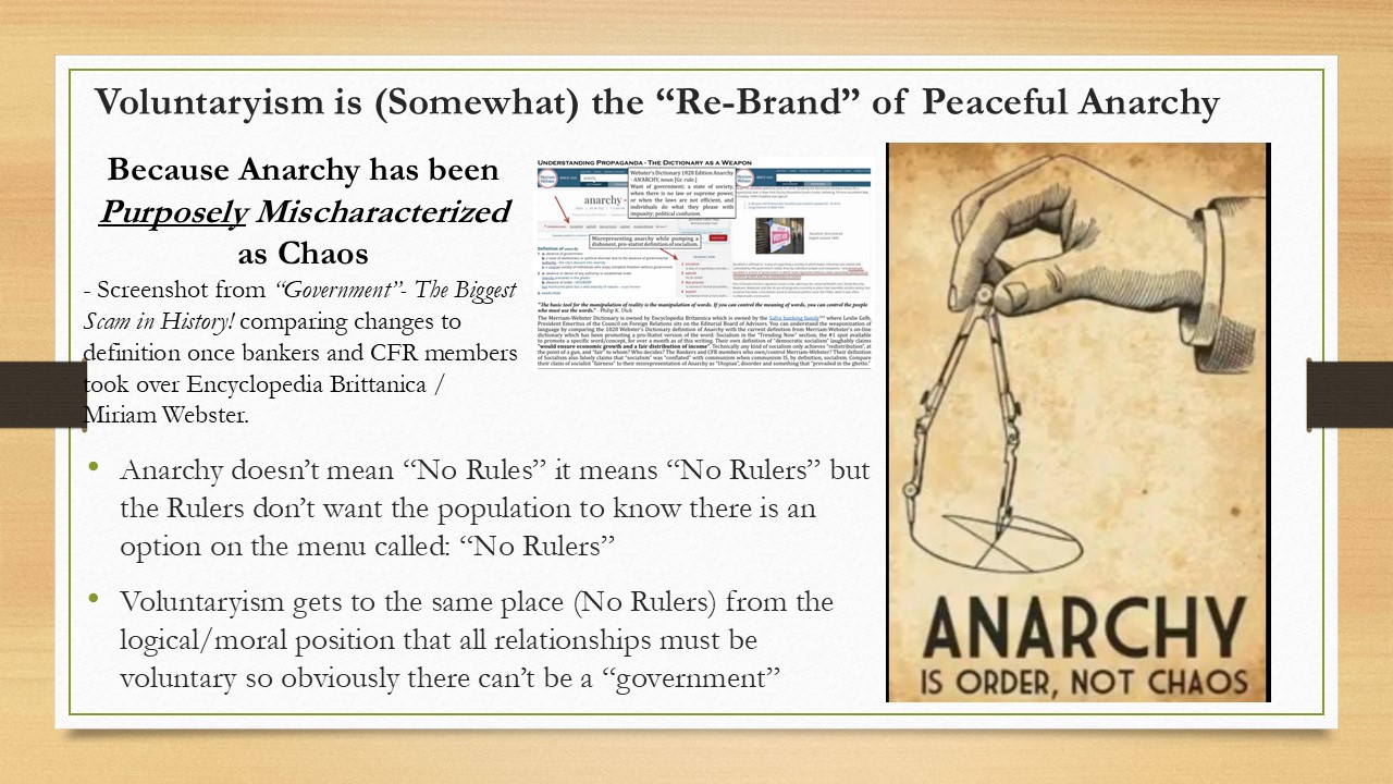 Voluntaryism is a little bit of the rebrand of peaceful anarchy. Now, for a lot of people who are tuning in from around the world, that name may scare you because anarchists have been associated with everything from violence to communism when, in reality, all anarchy means is “No Rulers.” It does NOT mean “No Rules”. It simply means “No Rulers, but “the rulers” because they don't want you to know that there's an option on the menu called “No Rulers.” They have used control of the media and even control of the dictionary. I break it down in my book “Government”- The Biggest Scam in History… Exposed! how they've changed the meaning over time so that the word for “No Rulers” now means: “Chaos and Dystopia” when that could not be further from the truth.