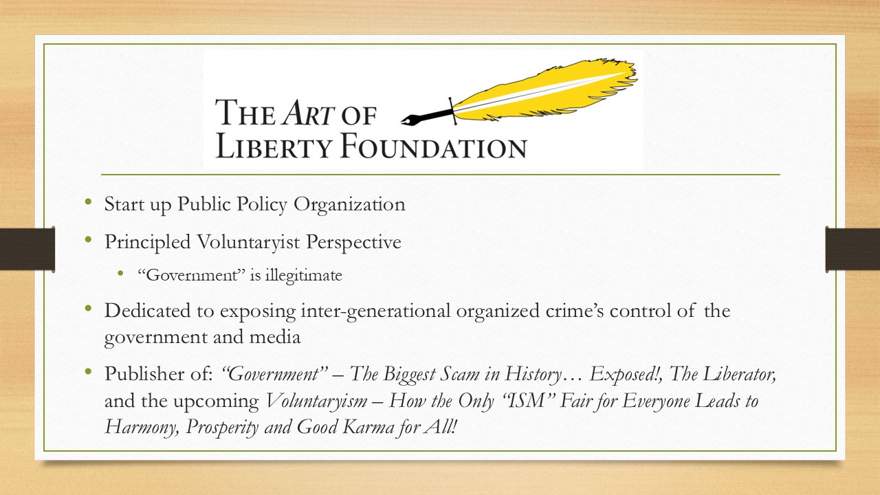 Etienne de la Boetie2 is the founder of the Art of Liberty Foundation, a startup public policy foundation exposing the illegitimacy and criminality of “government” from a principled voluntaryist perspective. He is the author of “Government” – The Biggest Scam in History… Exposed! – How Inter-Generational Organized Crime Runs the “Government,” Media and Academia – available at Government-Scam.com and Voluntaryism – How the Only “ISM” Fair for Everyone Leads to Harmony, Prosperity and Good Karma for All – available at Voluntaryism-Book.org.