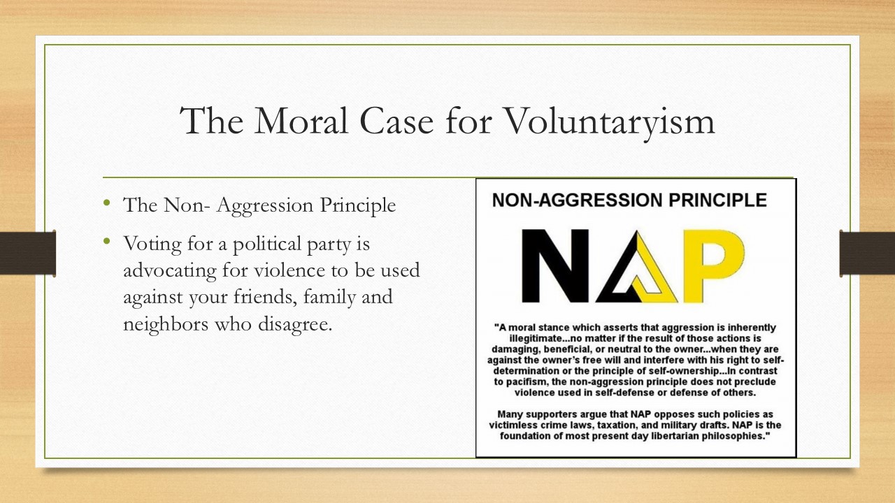 There's a moral case for voluntaryism, and it really is centered on something called the Non-Aggression Principle(NAP), which states that nobody has the ability to use violence or aggression on anybody else. And while that sounds like so basic that you would teach that to a kindergartner, you'd be amazed at how many people. give the government an exception from the Non-Aggression Principle and say: “Oh, well, the governments just got to do that because without it, how would we have roads? How would we have courts? How would we have all of these things that we desire?